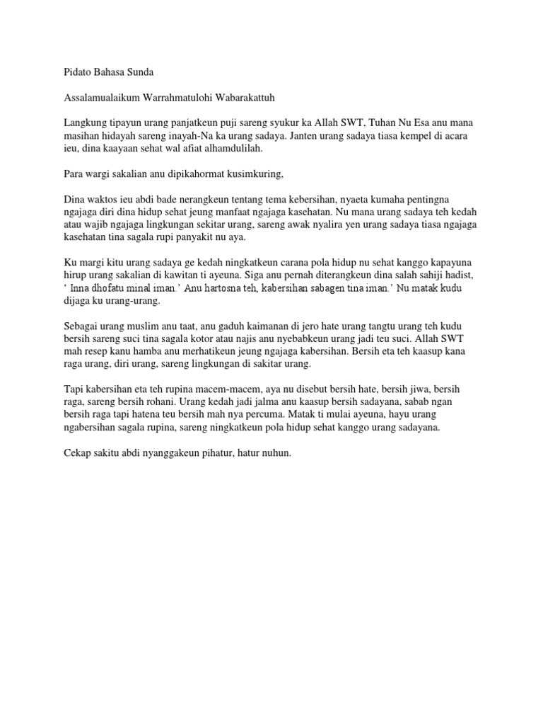 Bapa kepala sman 1 parigi anu ku simkuring dipihormat, bapak ustad anwar anu kusimkuring dipihormat. Pidato bahasa sunda singkat ini berisi 17 contoh pidato singkat bahasa sunda yang dapat membantumu membuat dan menguasai pidato ditambah dengan tema dan tujuan yang beragam. 5 contoh sajak bahasa sunda singkat. Jika ada pertanyaan seputar materi tarjamahan bahasa sunda yang kurang dipahami, kalian bisa memberikan komentar, silahkan jangan ragu untuk mengisi kolom komentar di bawah. Salasahiji cara miara awak nyaeta.a.